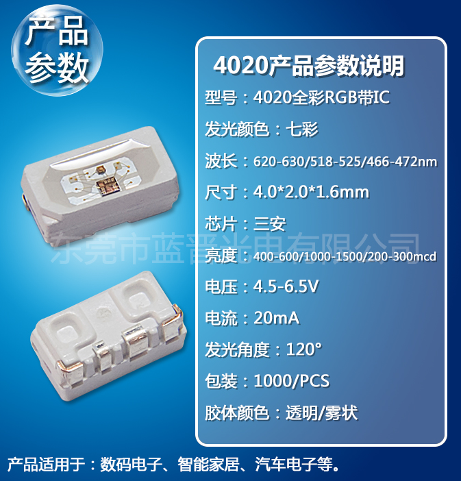 4020全彩RGB帶IC智能音響LED貼片燈珠廠家生產(chǎn),東莞藍(lán)晉光電廠家批量生產(chǎn),價(jià)格實(shí)惠。