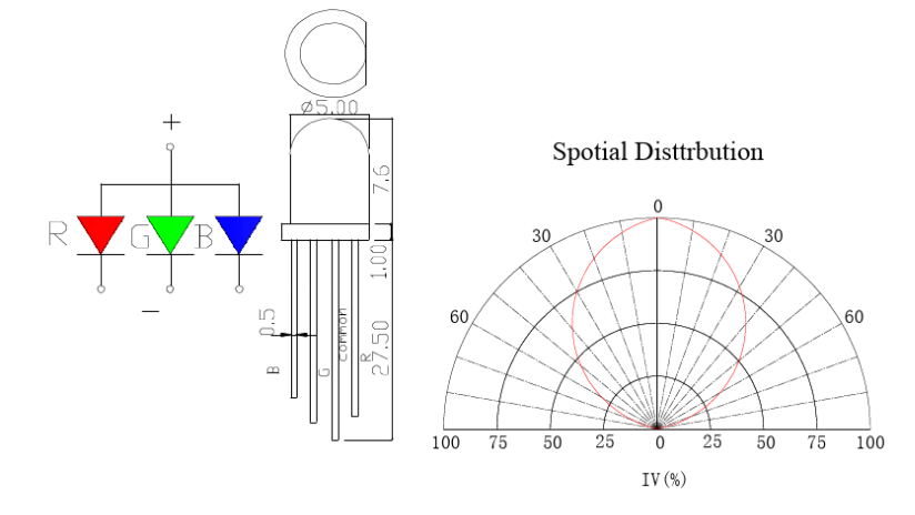全彩引腳說明:共陽極全彩四引腳,三個(gè)負(fù)極一個(gè)正極,不同引腳控制三個(gè)三原色燈珠,通過顏色的組合發(fā)出各種各樣的顏色,共陽極接通電流后再通過接通不同的三原色燈珠的其中一個(gè)或者兩個(gè)甚至全部三個(gè)負(fù)極引腳而發(fā)出不同的光來達(dá)到全彩的效果。 三原色(紅、黃、藍(lán)) 比如:共正極電流接通后,接通黃色發(fā)光芯片和接通藍(lán)色發(fā)光芯片的負(fù)極達(dá)到黃色和藍(lán)色同時(shí)發(fā)光組合為綠色,以此類推,不同的負(fù)引腳和共用正引腳搭配發(fā)光達(dá)到全彩。 性能參數(shù) 工作電壓:1.8-3.4(V) 功率:0.1(W) 外形尺寸 :5(mm) 型號(hào):F5/5mm全彩透明共陽 熱阻:≤5(°/W) 顯色指數(shù):70-80 發(fā)光角度:30(°) 芯片品牌:三安 基板材質(zhì):鐵 色容差:5(SDCM) 96小時(shí)加速老化:90(%) 1000小時(shí)常規(guī)老化:85(%)