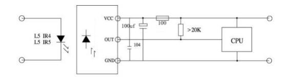 如下圖是紅外接收頭應(yīng)用原理圖,由于接收頭很容易受到外界信號干擾,特別是紅外光,因此在接收頭的供電兩端加上濾波電容,也就是說在VCC與GND之間并聯(lián)接一個電解電容以及瓷片電容,容量大小可根據(jù)藍(lán)晉光電廠家提供數(shù)據(jù)設(shè)計的即可;同時在輸出引腳上拉一個電阻,使信號更穩(wěn)定;VCC輸入串聯(lián)一個電阻,與電容組成RC,同時也起到限流降壓作用,進(jìn)一步加強(qiáng)接收頭穩(wěn)定性。