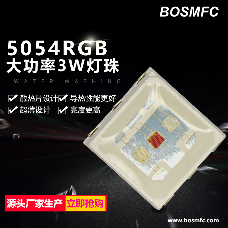 5054RGB全彩燈珠是由三顆0.5W的紅/綠/藍芯片封裝而成的,總功率達到了1.5W,采用5054帶散熱片的支架封裝,相比常規(guī)的5050RGB,首先是功率,常規(guī)的5050RGB最大功率是0.2W,而5054RGB燈珠最大功率是1.5W。