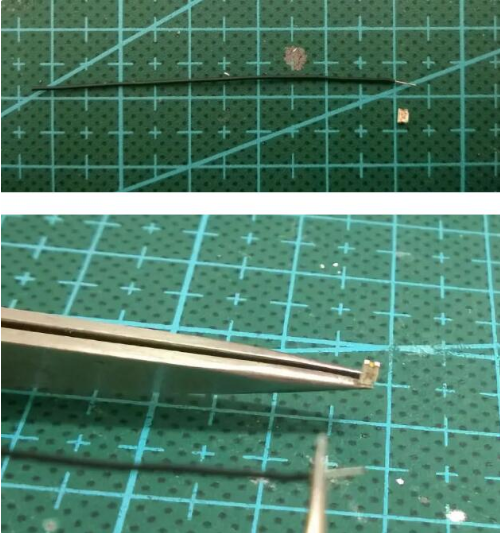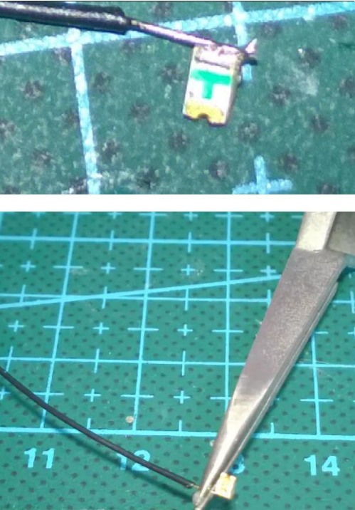 1、首先用鑷子夾住貼片,夾住1端的金屬部分或是側(cè)著夾都行,但是注意不要讓LED燈頭的塑料部分受力,不然在烙鐵加熱時會變軟擠壓變形。有綠色的那頭是負(fù)極。