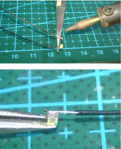 3、左手導(dǎo)線,右手烙鐵,首先烙鐵頭蹭干凈,然后導(dǎo)線有錫漿的部分輕觸在LED一段的金屬部分,用烙鐵輕輕點(diǎn)一下,不要太久,看到錫漿變成亮閃閃的金屬狀就行(注意不要墊在金屬物體上焊,由于散熱效果較好導(dǎo)致焊接的溫度老上不去),如果沒成功,擦干凈重復(fù)到步驟2再來。焊完后用金屬鑷子幫忙散下熱,小心燙傷。