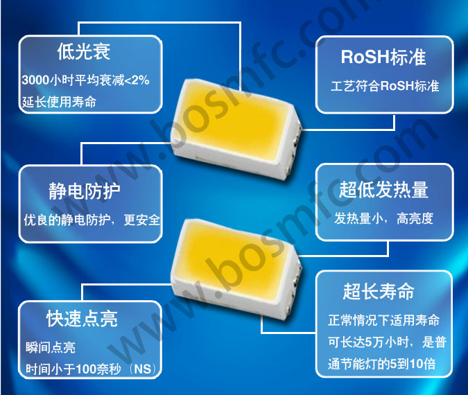 東莞市藍晉光電有限公司擁有16年的貼片LED研發(fā)生產(chǎn)經(jīng)驗,秉承完美品質(zhì)的理念,精益求精、在封裝工藝上采用高端原材料、嚴格管控制程、強化信賴性實施,全方面模擬客戶使用條件進行實驗,力爭在同等價位,做出品質(zhì)。公司主營非標產(chǎn)品在側(cè)發(fā)光、耐高溫、超長腳、抗衰減、高顯指、混顏色方面積累了豐富的經(jīng)驗,主要產(chǎn)品有紅外LED、紫外LED和貼片LED。貼片Led燈珠,直插led燈珠,3535貼片led燈珠 ,5050貼片led, 3535貼片led,  5630貼片led, 5730貼片led,2835貼片led, 3014貼片燈珠,草帽Led燈珠,1w貼片燈珠, f5mm貼片燈珠, F8mm貼片燈珠.